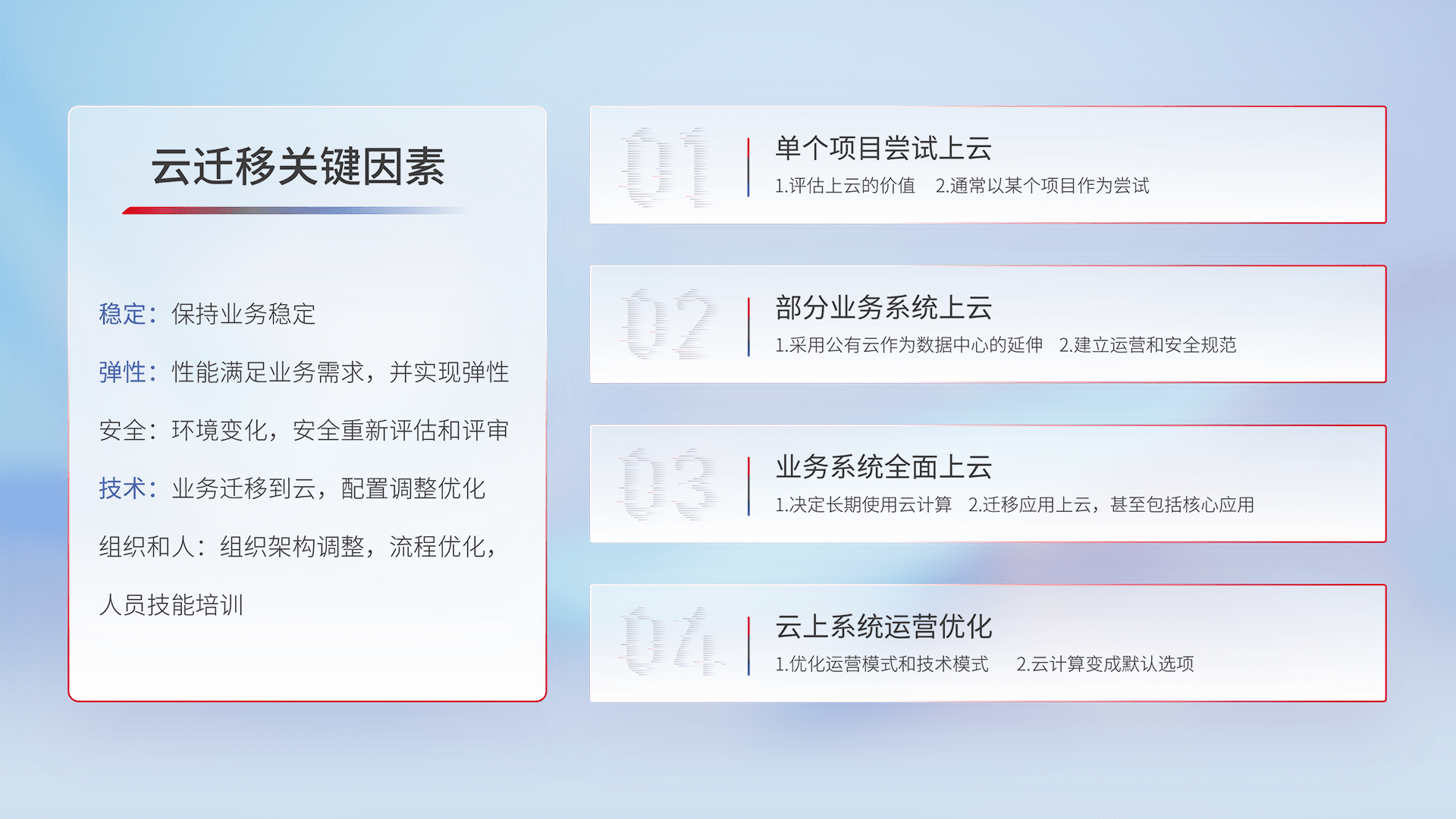 结合实际业务,,,从规划设计、、云平台选型、、、云原生改造、、数据迁移、、集成交付,,,,迁移全过程为客户识别最佳上云路径,,做好风险识别管理,,,设计网络架构、、、身份权限、、安全审计合规、、、、操作审计、、日志审计、、、监控告警策略、、、、多站点容灾设计等,,,,对云上基础设施进行整体规划,,提升IT治理水平,,,,以满足弹性、、、高可用、、、高性能的需求。。。