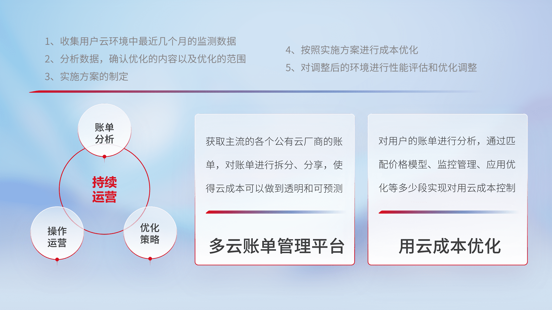 通过多云纳管,,,以统一的资源数据模型把客户的云资源进行抽象和封装,,,,进而实现对多云资源的统一操作,,保障云资源管理的可靠性、、、、稳定性与可用性。。。。量身定制化运维内容,,,,配置、、开发运维、、、、补丁管理、、、备份、、、监控、、、、认证和访问管理、、、、审计和日常巡检等,,,保障在用云过程中的可靠度,,稳定度以及高可用率。。。