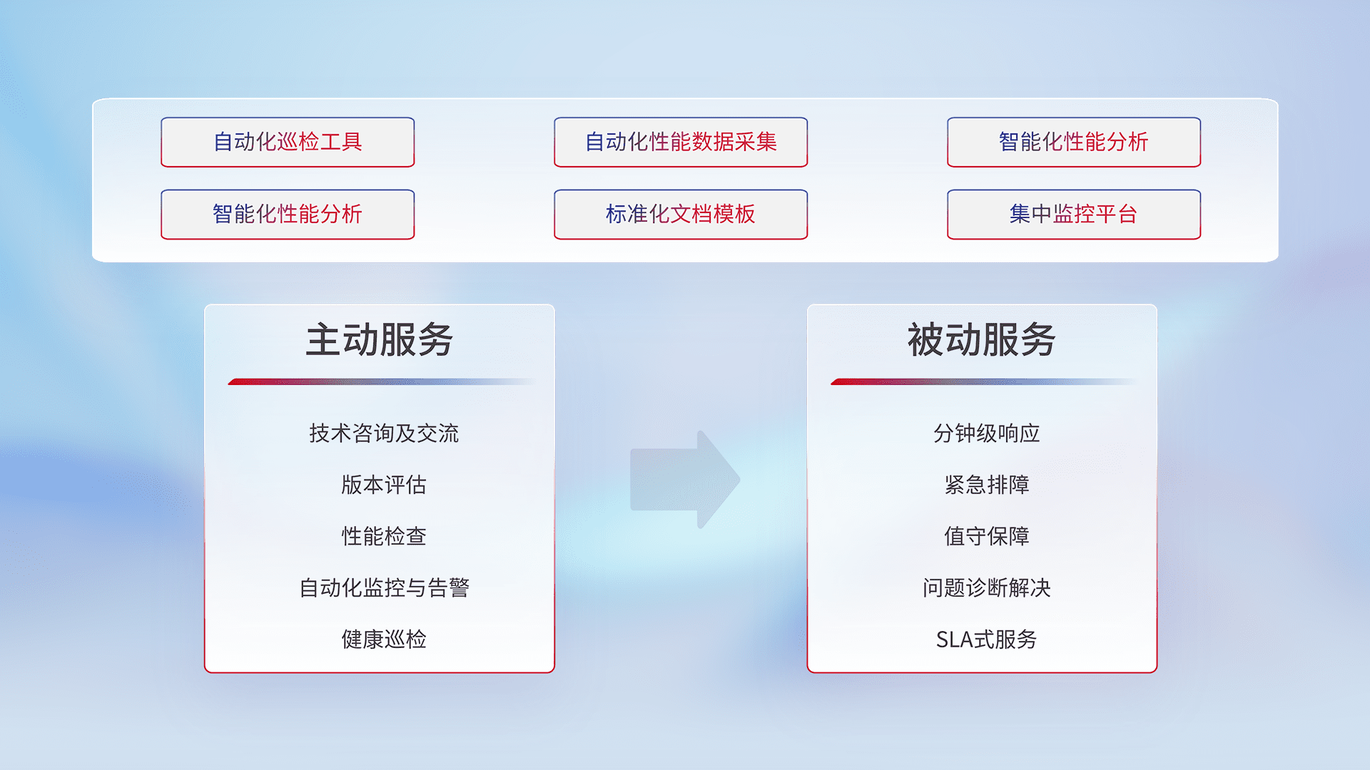 智能化工具和标准化文档,,,,保障服务质量,,,,提供主动服务(包含技术咨询、、、、版本评估、、性能检查、、、、自动化监控与告警、、、、健康巡检)和被动服务包含(分钟级响应、、紧急排障、、、值守保障、、、问题诊断解决、、SLA服务)。。。。